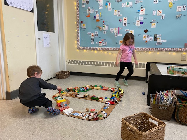 Frankie and Greyson, building a village using the wooden cars and cork road.